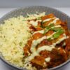 Breast of chicken cooked Oriental style in a sweet and sour sauce with chunky onions and peppers served with seasoned and steamed cauliflower rice.